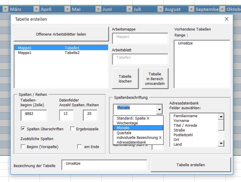 o Optional: Überschriften, Vorspalte, Spalte am Ende,